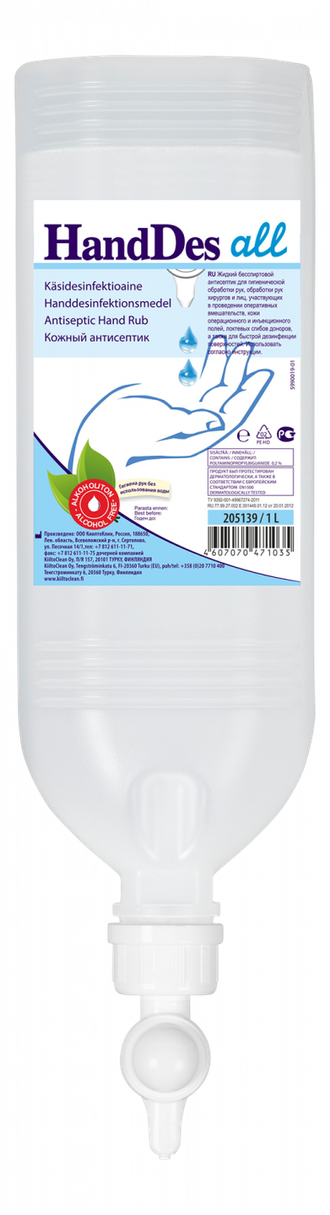 Съемный блок для диспенсеров Kiilto HandDes в объеме 1 литр используется для гигиенической обработки рук медицинских работников, на предприятиях пищевой промышленности и общественного питания, профессиональных кухнях, на производстве и в офисе. Убивает до 99% микробов, не вызывает аллергической реакции и не содержит ароматизаторов.